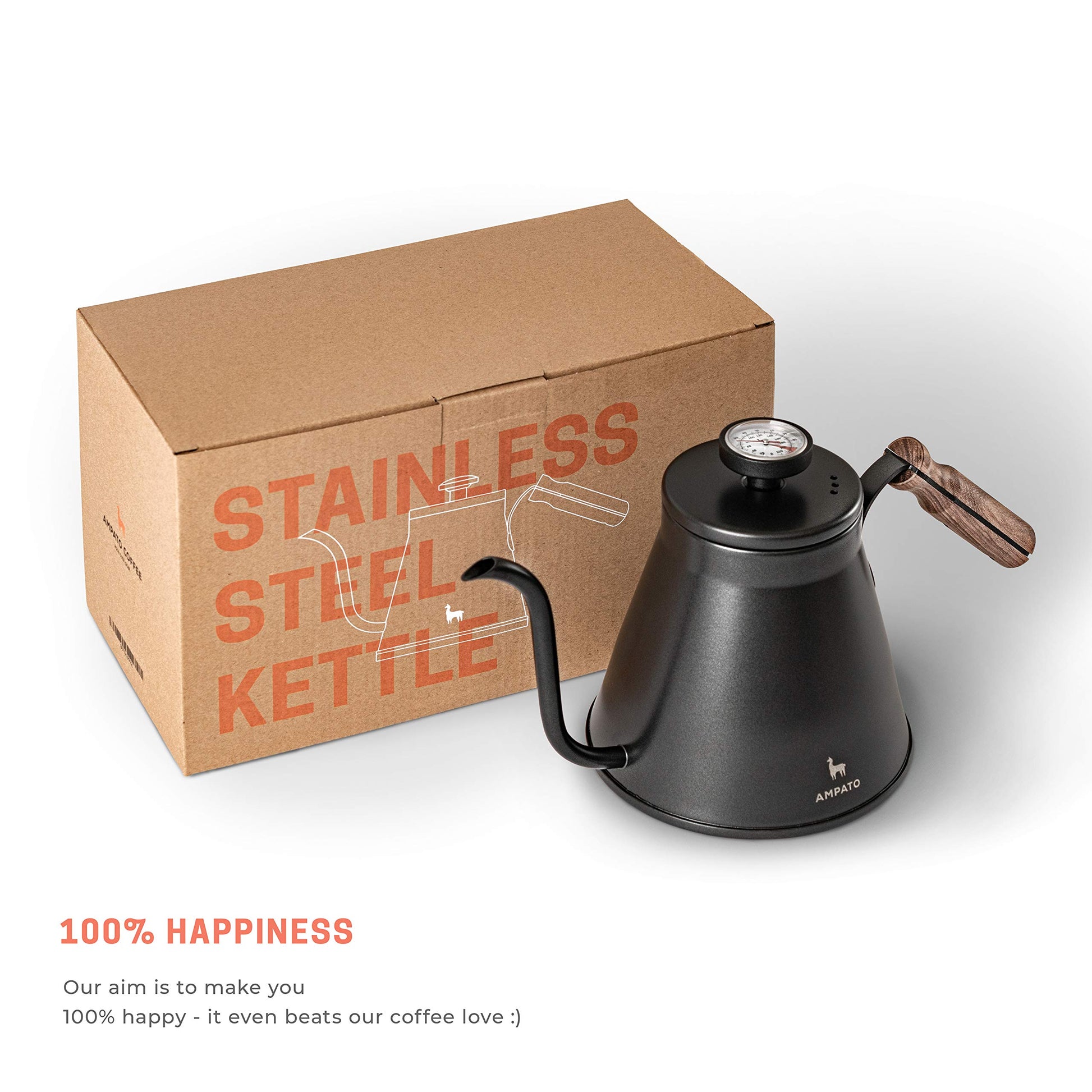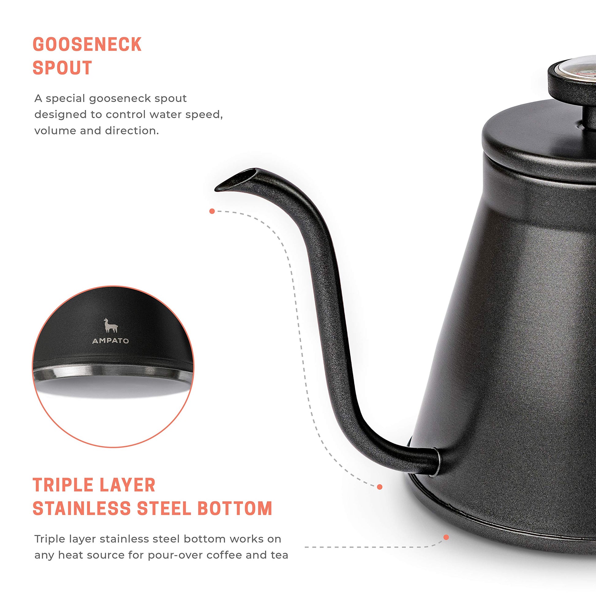 Pour Over Kettle - AMPATO Gooseneck Kettle with Thermometer - Barista Quality - Triple Layered Stainless Steel Bottom for Drip Coffee and Tea Brewing on all Stovetops - 36 floz