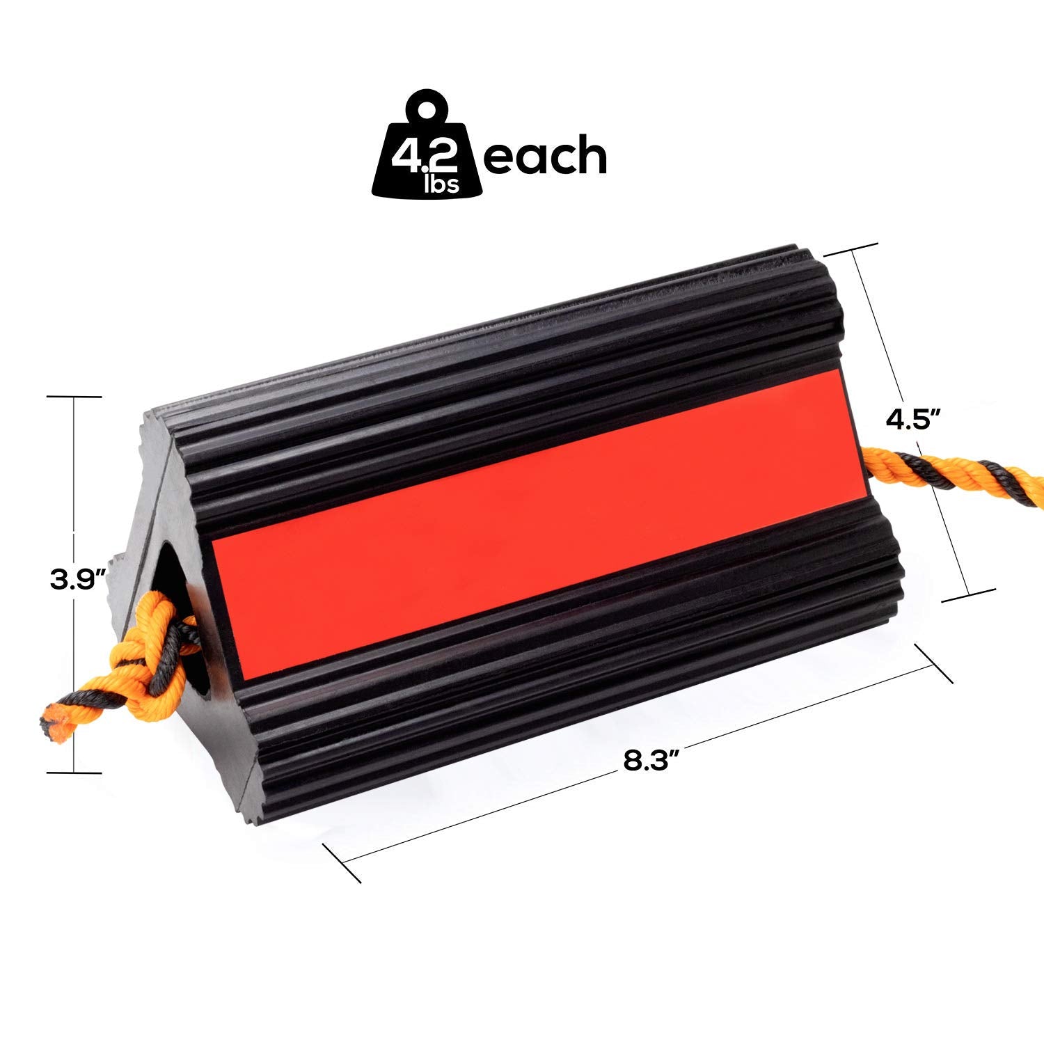 - EASY TO USE: Weighing just 4.2lbs each, these chocks are easy to place and remove. Measuring 8.3” x 4.5” x 3.9”, they are large enough to provide solid support while being small enough to use comfortably. Clear red stripes also improve visibility.
